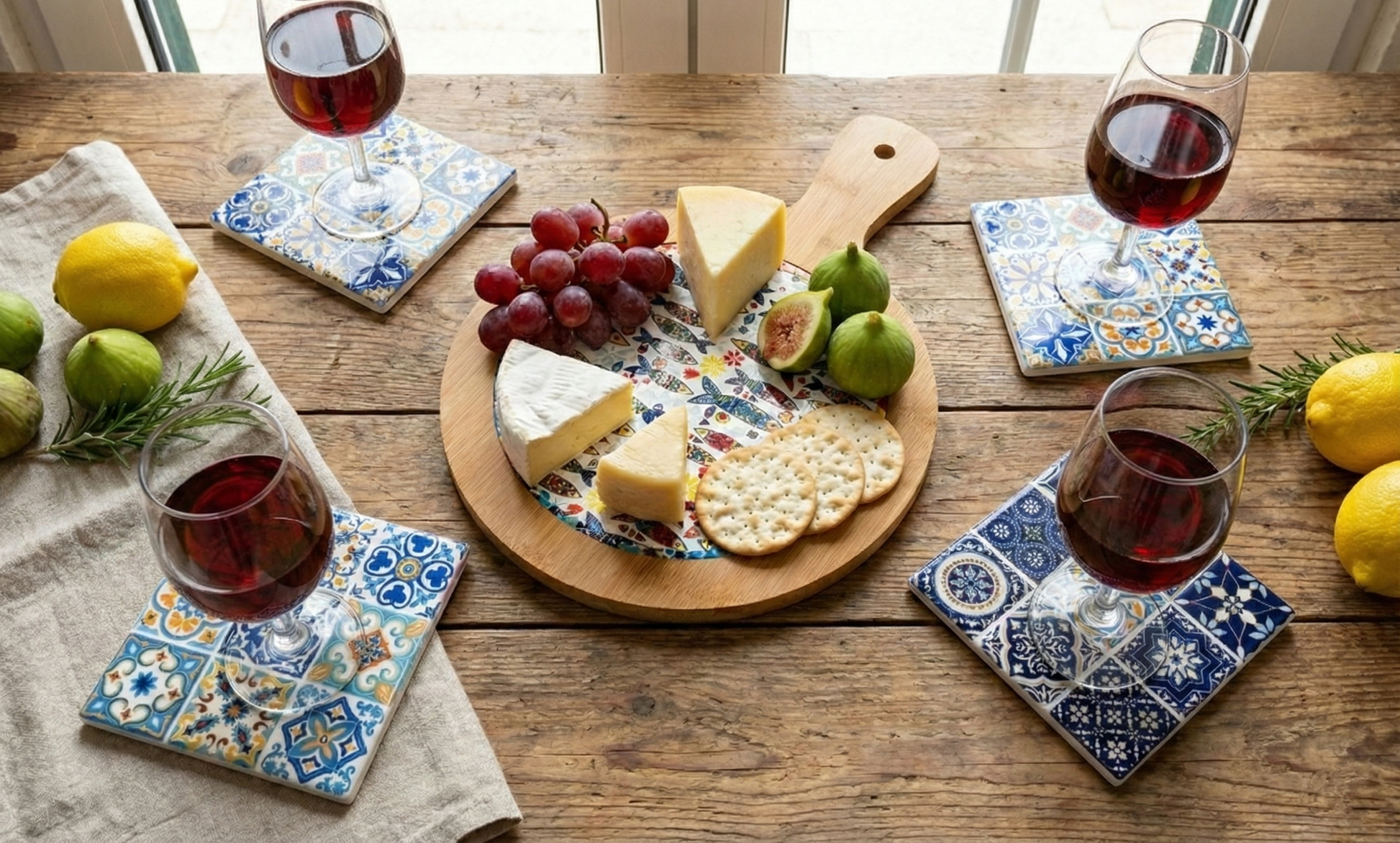 Versatilitate: Ideal pentru a servi brânzeturi, mezeluri fine (petiscos), tapas sau fructe. Suporturile protejează masa și adaugă o notă de rafinament oricărei băuturi, de la cafeaua de dimineață la un pahar de vin rece seara.